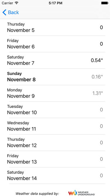 If desired, you can view the day-by-day data that made up this report by tapping on the summary (e.g. "(0.86" rain expected the prior week)")